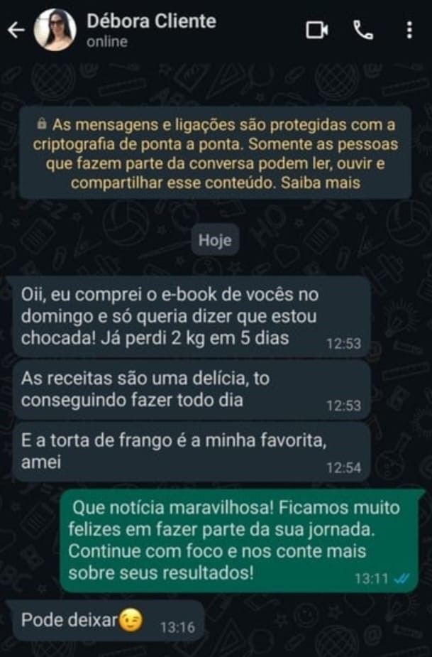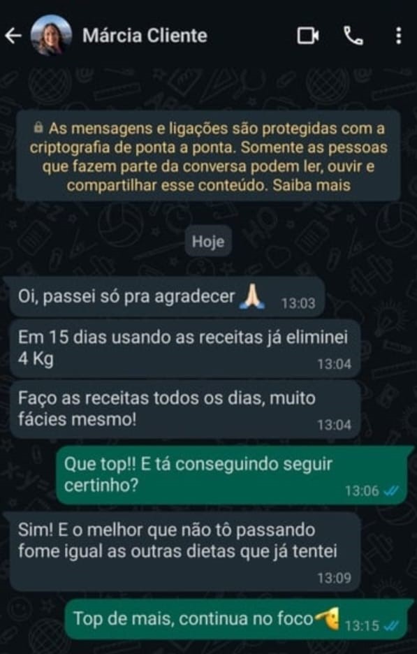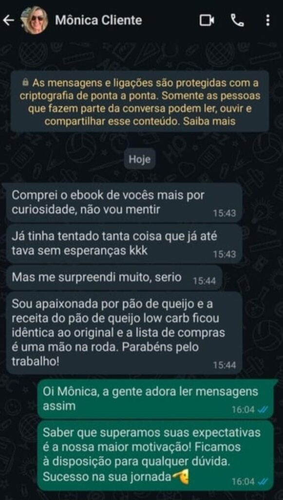 “Perdi 8 kg em 1 mês sem deixar de comer o que amo! recuperei minha autoestima. A coxinha low carb é minha salvação!”