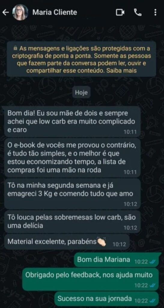 “Sempre fui viciada em doces, mas com o Brownie e o Mousse Low Carb, não sinto mais vontade de sabotar minha dieta. Perdi 10 kg e me sinto mais disposta!”