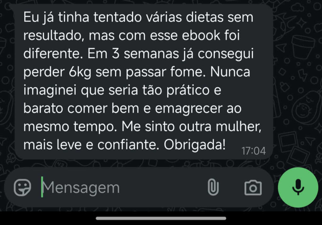 Você já sabe como é frustrante tentar emagrecer e não ter resultado duradouro. Com este eBook, você descobre um caminho simples, prático e sem fome para emagrecer de verdade.